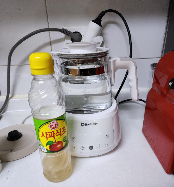 두번째 유리 세척이다. 유리로된 냄비나 주전자를 사용해본 사람이라면 세척 방법을 알고 있을 것이다. 식초로 한번 끓여주는 것이다. 식초 세척도 어떤 식초라도 상관이 없다. 필자는 집에서 쓰고 있는 사과식초를 사용했다. 비율은 크게 중요하지 않다. 적당히 넣어주자. 물은 최대로 넣어주고 끓여주는게 좋을 것 같다. 이렇게 유리부분까지 세척을 완료했다면 이제 아이에게 줄 분유물을 만들수 있다.