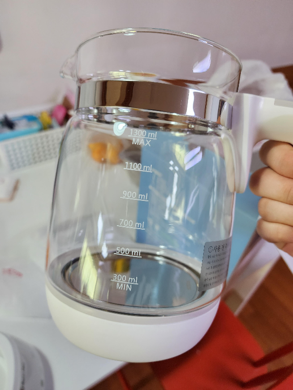 위 사진을 보면 일반 포트기랑 다를게 없다. 용량은 1.3L로 생각보다 용량이 크다. 아이 개월 수에 따라 분유의 양이 늘어나지만 분유 타는데는 무리가 없다. 바닥면에만 스테인리스 재질이고 나머지는 통유리이다. 손잡이 부분에 있는 스테인리스는 손잡이를 장착하기 위한 것이다.