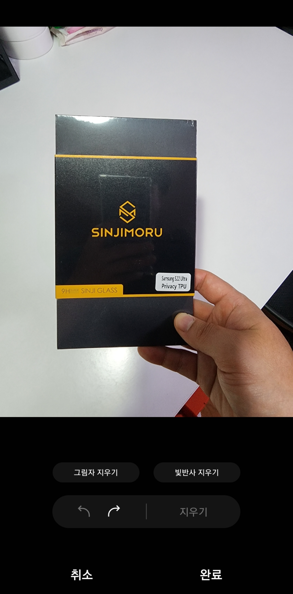 자, 저것이 샘플 사진이다. 필자의 폰을 갤럭시 S22 Ultra로 바꾸면서 액정보호필름을 구매했었다. 액정보호필름에 관한 포스팅을 하다가 빛반사가 발생하여서 이 사진으로 도전해보았다. AI 빛반사 지우기 버튼을 누르니 빛반사를 없애주지 못하였다.