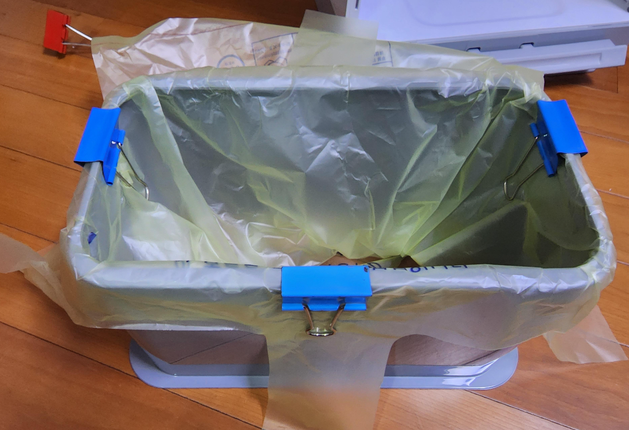위에 보이는 대로 클립을 장착해서 사용하기 시작했다. 뒤쪽에 클립이 없다 보니, 양 옆에 있는 클립들을 조금 뒤로 배치해서 끼워 주었다. 이렇게 하면 뒤쪽에 장착하지 못한 클립 때문에, 종량제 봉투가 빠지는 일을 조금이라도 줄여 줄 것만 같은 공학도 필자의 생각이었다.