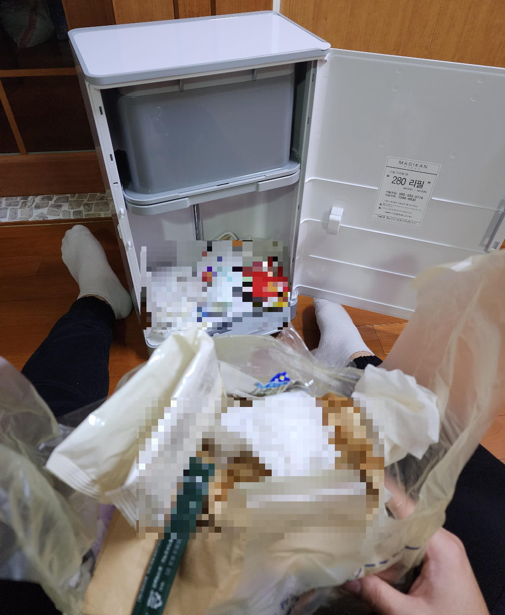 그것은 매직캔에 종량제 봉투를 끼우는 방법인데, 100% 호환이 되지 않는다. 당연히 매직캔을 만드는 회사의 경우, 본사에서 만든 리필 비닐을 사용하도록 권장한다. 물론 제품에 맞게 나온 소모품을 사용하는 것이 맞다. 하지만 가성비를 생각해 볼 수 있다. 그냥 매직캔을 사용하다가 쓰레기가 가득 차면 리필 봉투를 잘라서 묶어서 종량제 봉투에 담아 배출해야 한다. 여기서 리필 봉투와 종량제 봉투, 2가지 소모품이 소모된다. 리필봉투 묶는 타이밍에 따라 종량제 봉투가 남을 수도 있고 넘칠 수도 있다. 필자는 최대로 묶어도 종량제 봉투를 넘어본 적은 없다. 다만 종량제 봉투가 남아서 이걸 묶어야 하나.. 하는 고민할 했던 적이 많이 있다. 그럴 때 모든 쓰레기통의 쓰레기를 모아서 버리곤 했는데, 이 귀찮음이 좀 커졌다. 그래서 매직캔 쓰레기통에 종량제 봉투를 끼워 사용할 생각을 하게 되었다.