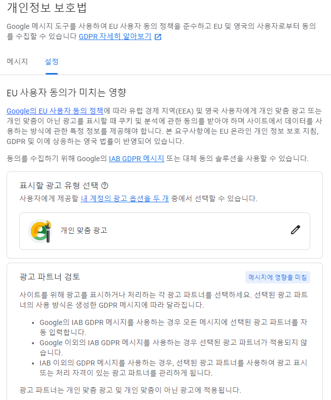 표시할 광고 유형 선택에서 개인 맞춤광고로 설정되어 있기에, 이는 따로 만질 필요가 없어 보입니다.