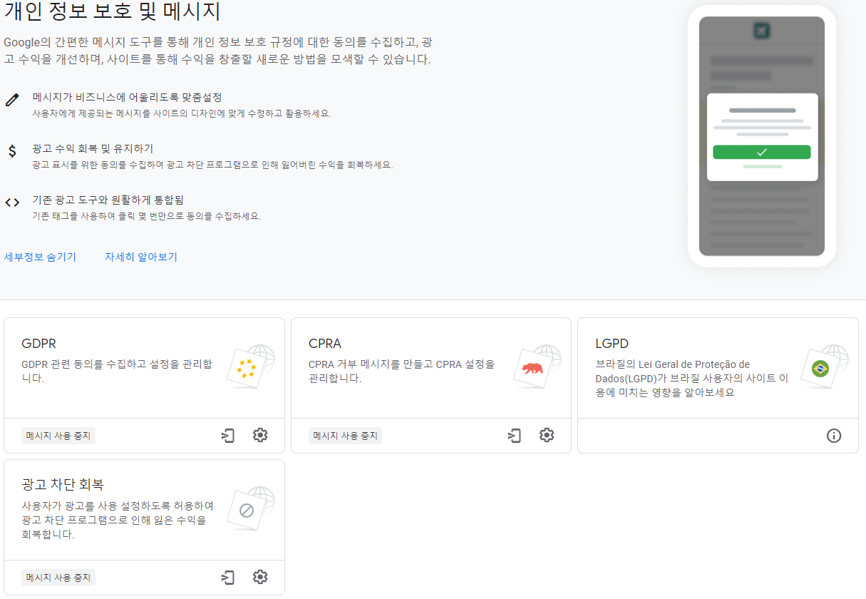 GDPR, CPRA, LGPD, 광고 차단회복. 총 4가지 메뉴가 있어요.