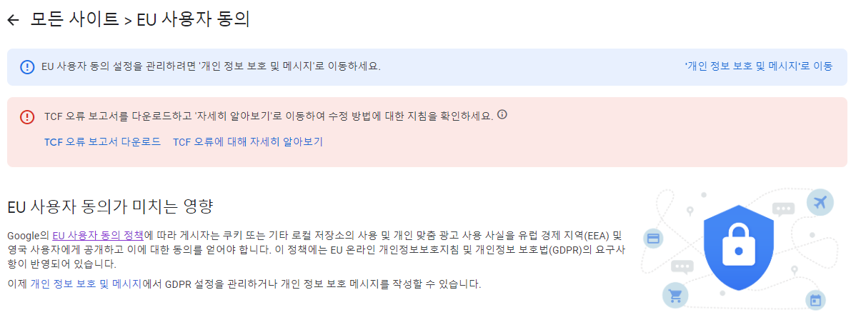 EU 사용자 동의 정책에 따라 개인 맞춤 광고 사용 사실을 유럽 경제 지역(EEA) 및 영국 사용자에게 공개하고 이에 대한 동의를 얻어야 한다고 적혀있네요.