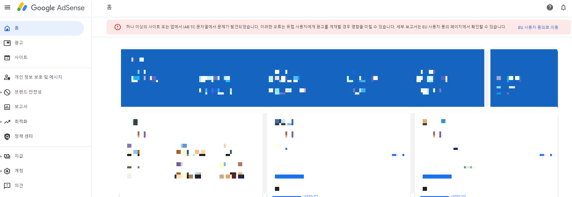 수익이 눈에 띄게 줄어들거나 광고 노출이 안되지 않는 것으로 확인되네요.
