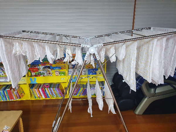 마지막으로 해줘야 할 것은 잘 말리는 것이다. 건조기를 돌리는 방법도 있으나 신생아 의류까지 건조기에 돌리기엔 살짝 불안한 감이 있다. 필자는 자연건조를 택했다. 건조대 자리가 부족할 수 있으나, 손수건이 얇기 때문에 두세 장씩 겹쳐 널어놓아도 금방 마르는 것을 볼 수 있다.