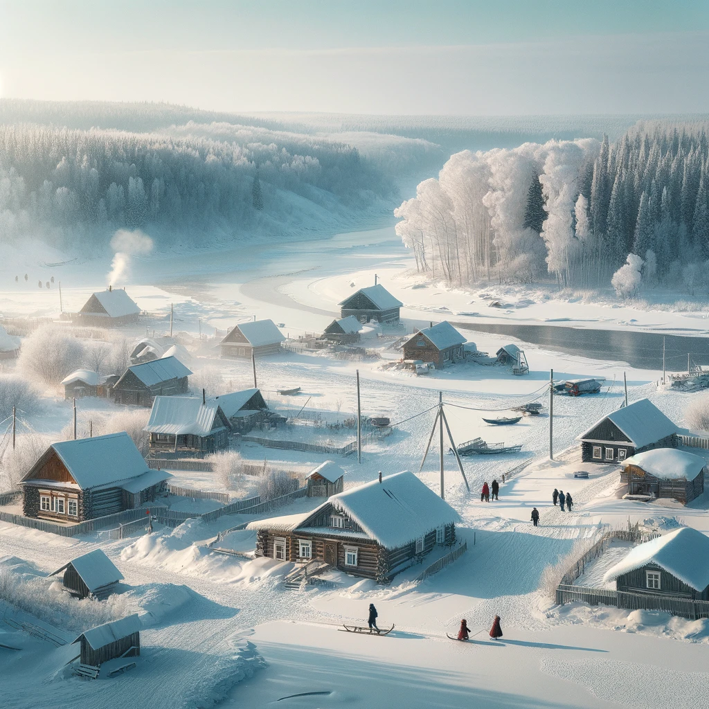 전통적인 러시아 가옥이 눈으로 덮힌 작은 마을, 얼어붙은 강, 그리고 배경의 울창한 숲이 보입니다.