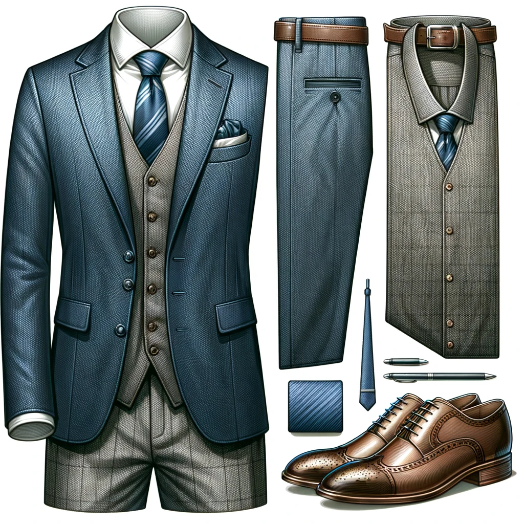 전형적으로 재킷(코트)과 같은 색상과 소재의 바지로 구성되며, 때로는 조끼(베스트)가 포함되기도 합니다.