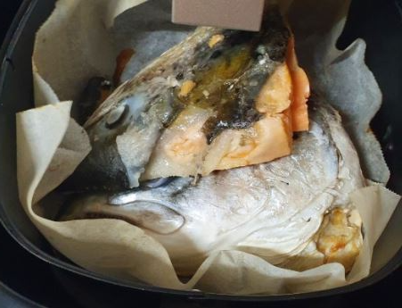 1. 연어머리를 에어프라이어에 넣고, 소금과 참기름으로 간을 한다.