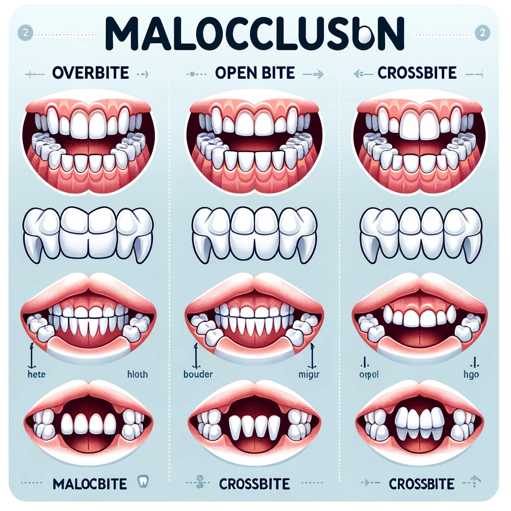 부정교합에는 여러 종류가 있어. 일반적으로 '과교합', '개방교합', '교차교합' 같은 용어로 분류되곤 해. 이런 상태들이 생기는 원인은 다양해. 유전이 큰 역할을 하기도 하고, 어린 시절의 습관이나 발달 문제, 심지어는 사고나 부상으로 인한 결과일 수도 있지.