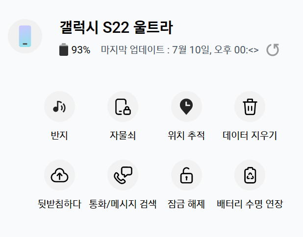 왼쪽 상단부터 오른쪽 하단순서대로 벨소리, 잠그기, 위치추적, 데이터삭제, 백업, 통화/메세지 가져오기, 잠금 해제, 배터리 수명연장입니다.