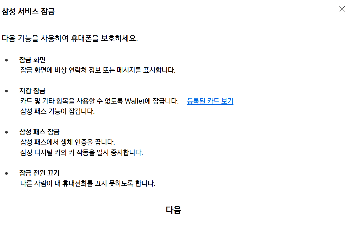 - 지감 잠금 : 카드 및 기타 항목을 사용할 수 없도록 Wallet을 잠금니다. 삼성 패스 기능이 잠깁니다.