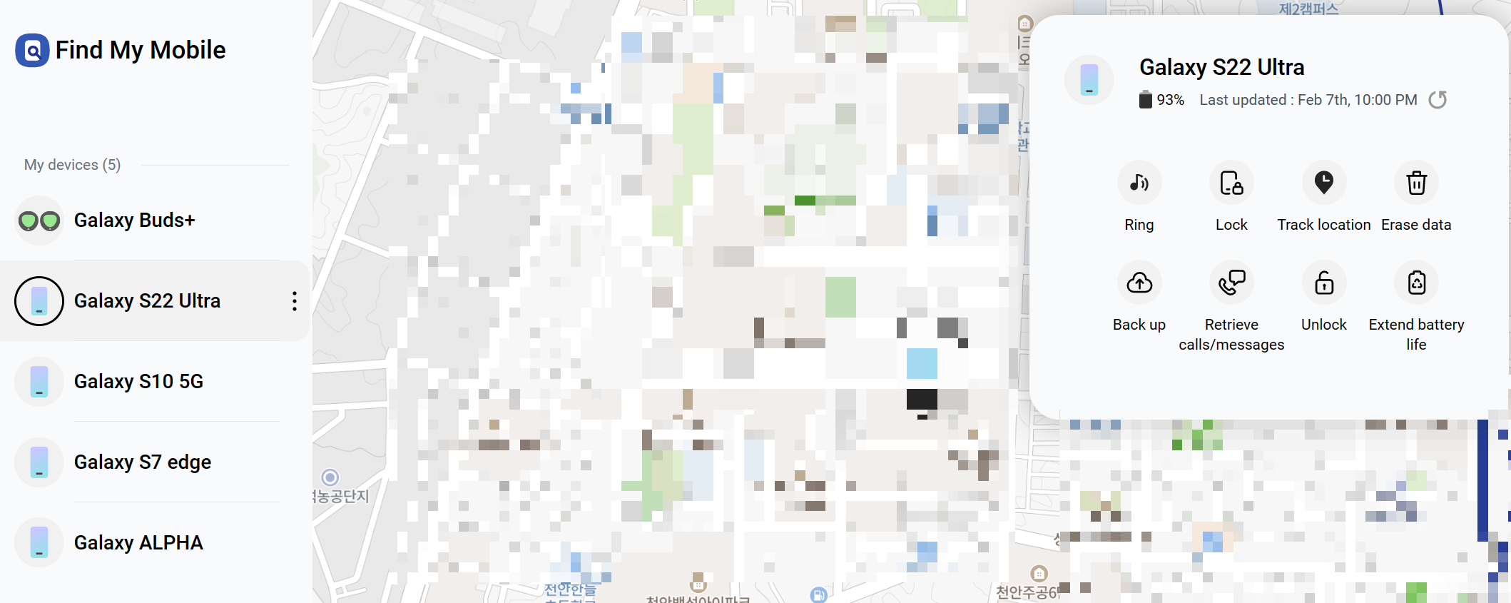 본인의 계정으로 로그인을 하면 됩니다. 삼성계정 또는 구글계정으로 로그인을 하게 되면, 위와 같이 내가 가지고 있는 기기들이 좌측에 목록에 나옵니다. 그리고 찾고자 하는 기기를 클릭하여 어느 위치에 있는지 먼저 확인합니다.