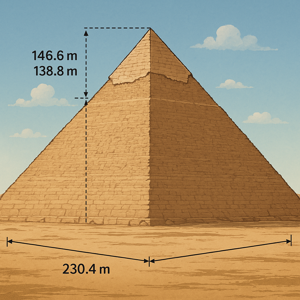 - 기저면 길이: 각 변의 길이는 약 230.4m, 거의 축구장 2.5개 정도를 나란히 놓은 길이입니다.
