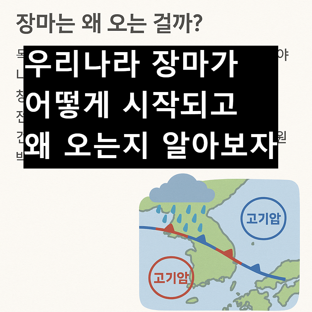 장마는 북태평양 고기압과 오호츠크해 고기압의 충돌로 발생하며, 습한 공기가 정체되어 집중호우를 일으키는 현상입니다.